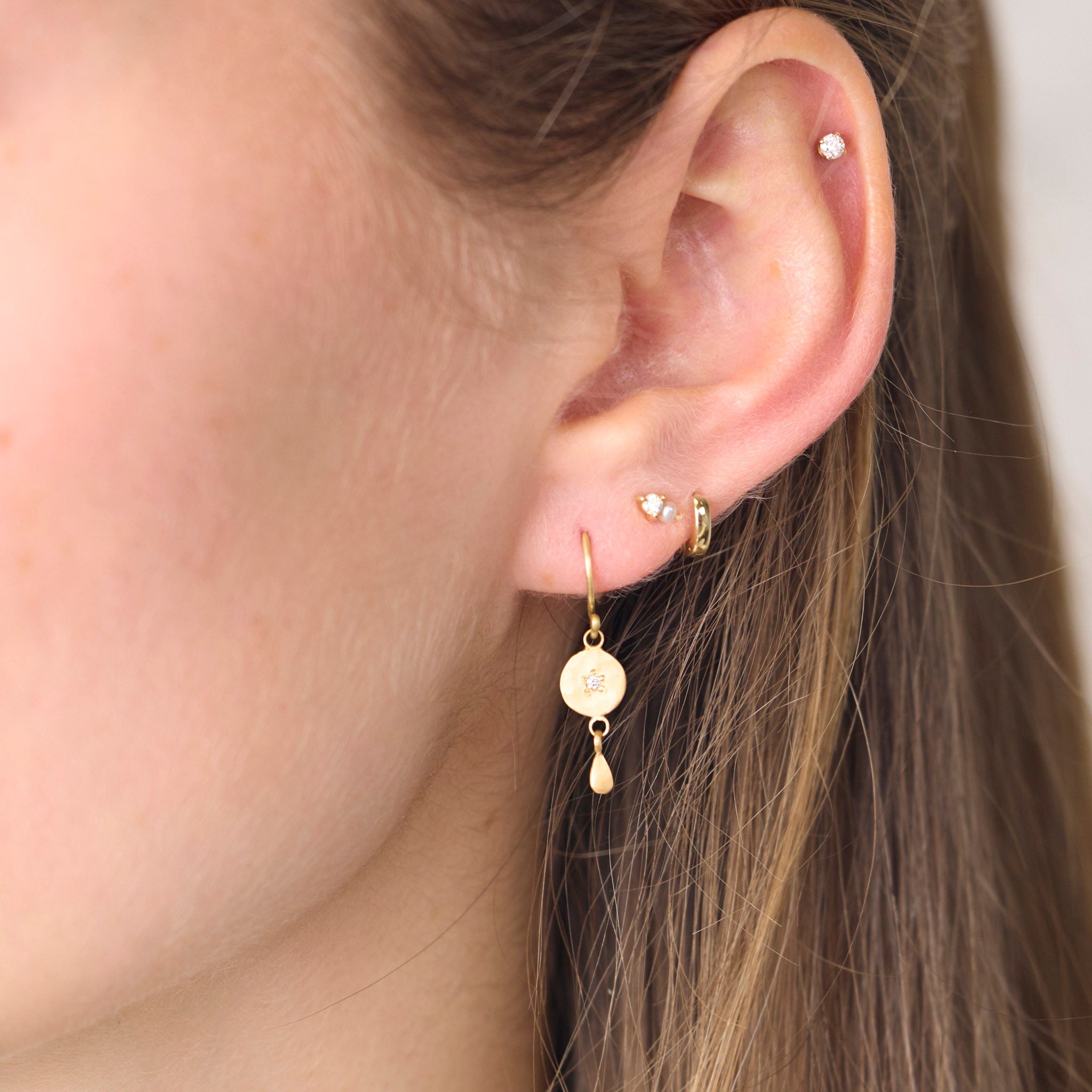 A single diamond sparkles in the center of each these sweet 22k gold disk earrings, with a delicate 22k gold leaf suspended from each one. A special addition to your jewelry collection.