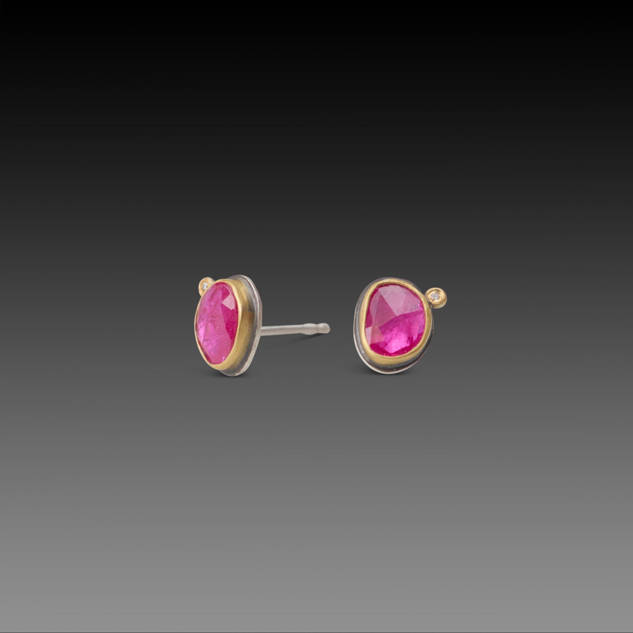 Celebrate with these ruby stud earrings accented with a single diamond dot. Accentuated by 22k bezel with silver backs. Earrings measure approximately 1/3 inch. Matte finish.