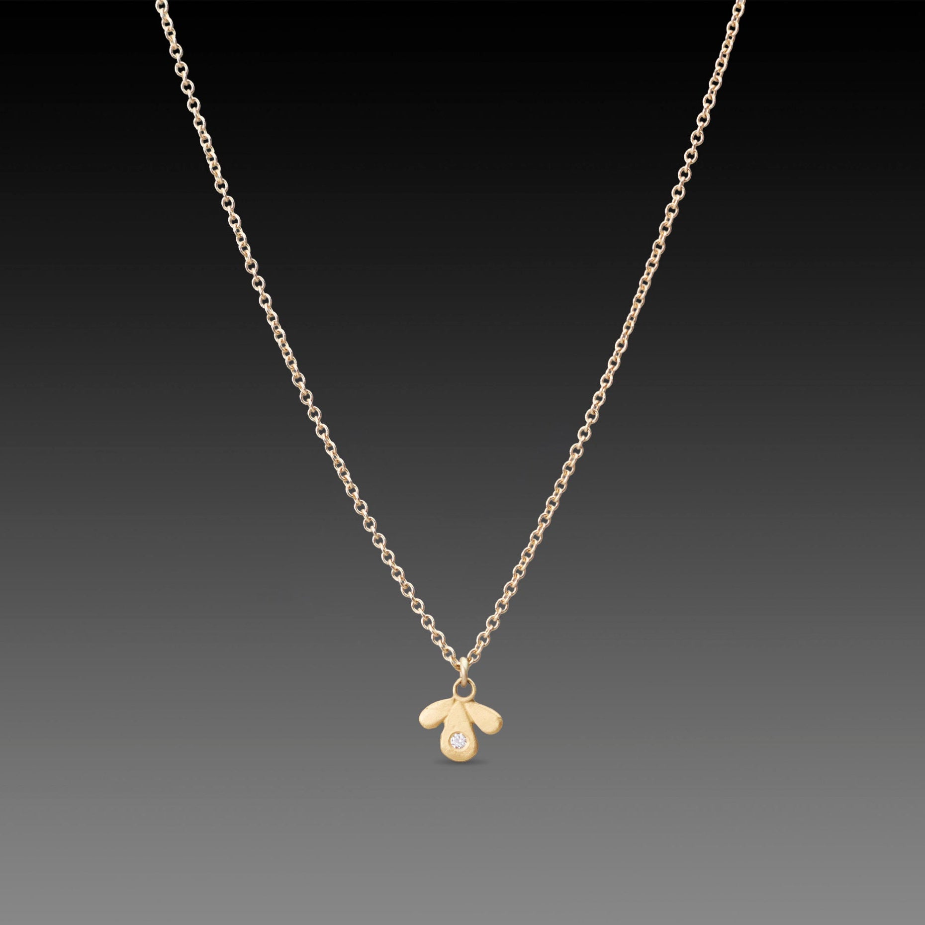 The sweetest little 22k gold leaf trio charm is set with a single sparkling diamond, and suspended from a delicate 14k gold chain. Delicate and elegant.