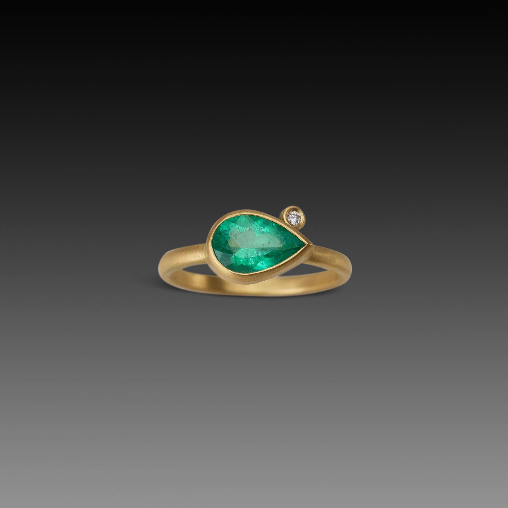 A vibrant green emerald is wrapped in warm 18k gold, and accented by a sparkling white diamond. The bezel is set on a slightly rounded 2mm 18k gold band. This ring stacks beautifully with others in our assortment and would be a very special addition to your jewelry collection.