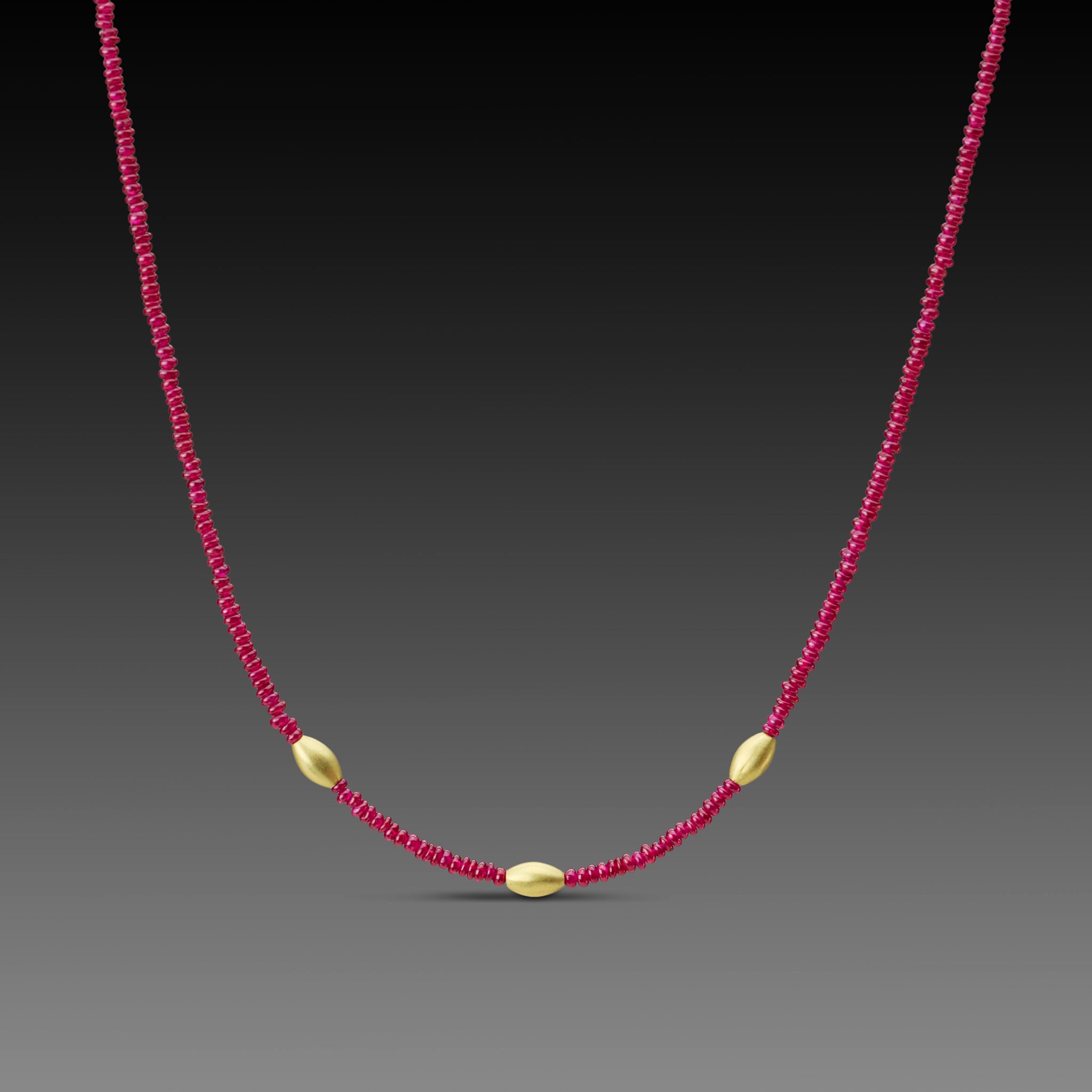 Tiny yet vibrant smooth ruby beads are punctuated by a trio of matte, warm 20k gold rice beads. Perfect to wear alone, or to layer with other necklaces in your collection, this necklace gives the perfect pop of color!