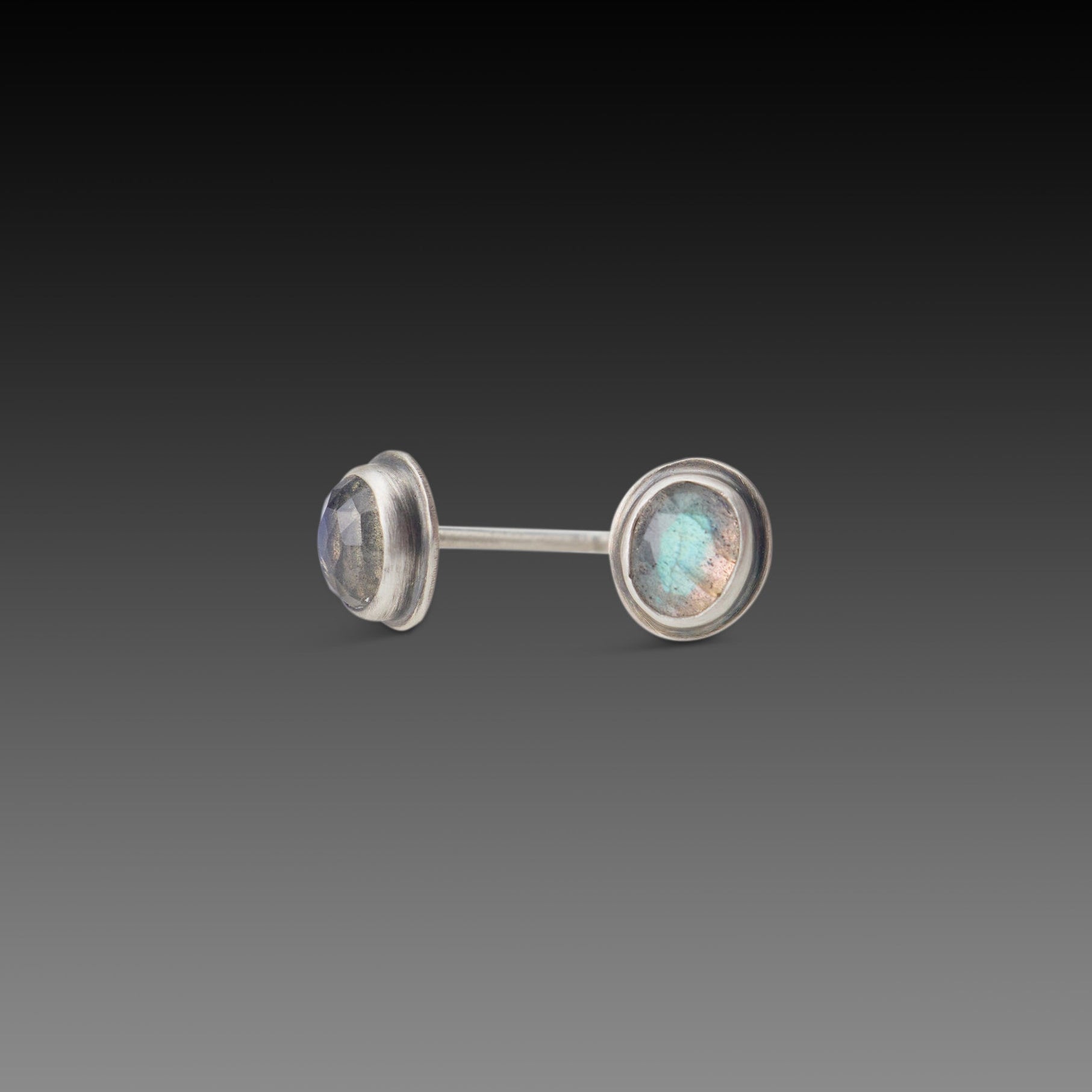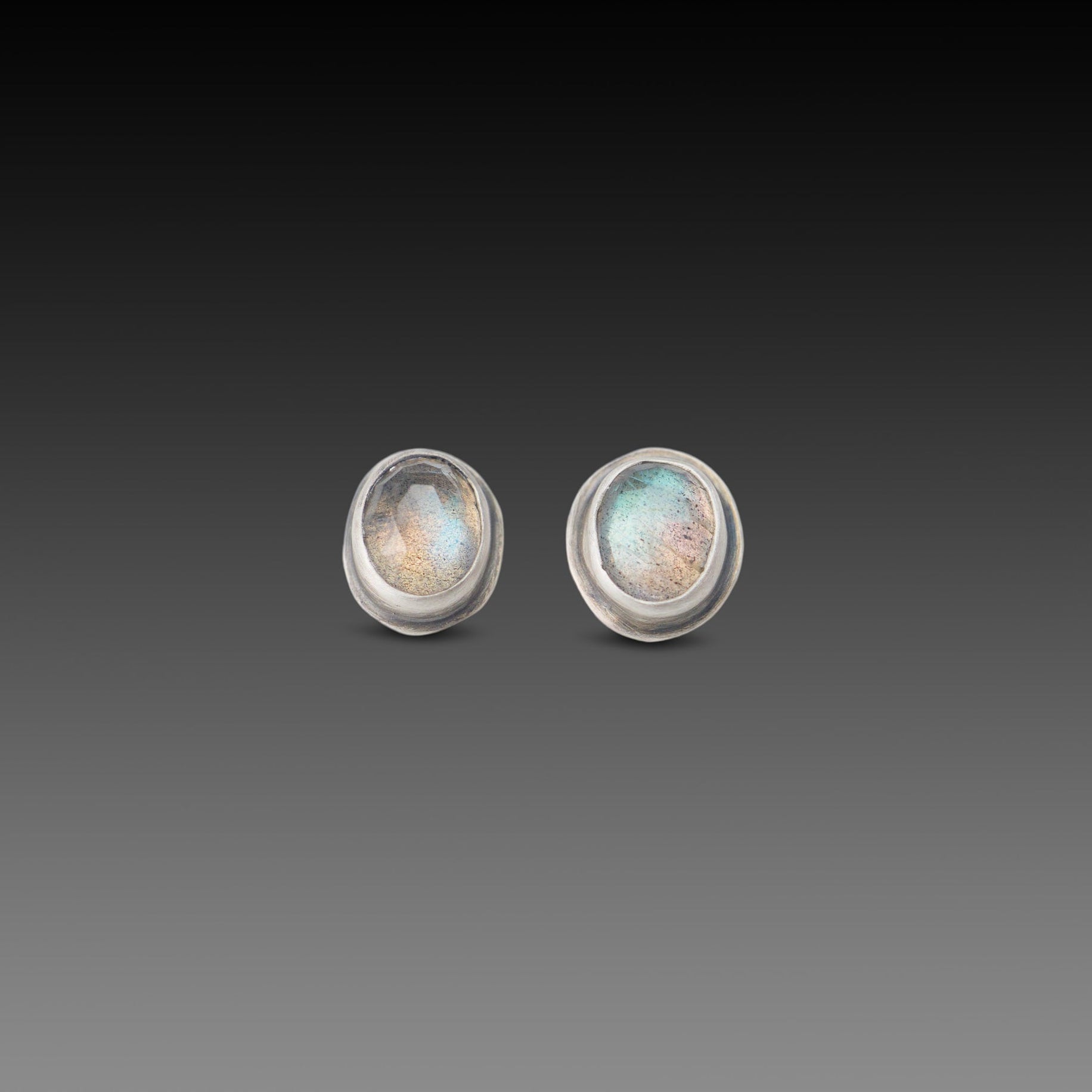 Hints of many colors illuminate these lovely labradorite stud earrings. Set in and backed with sterling silver. Delicate and elegant.