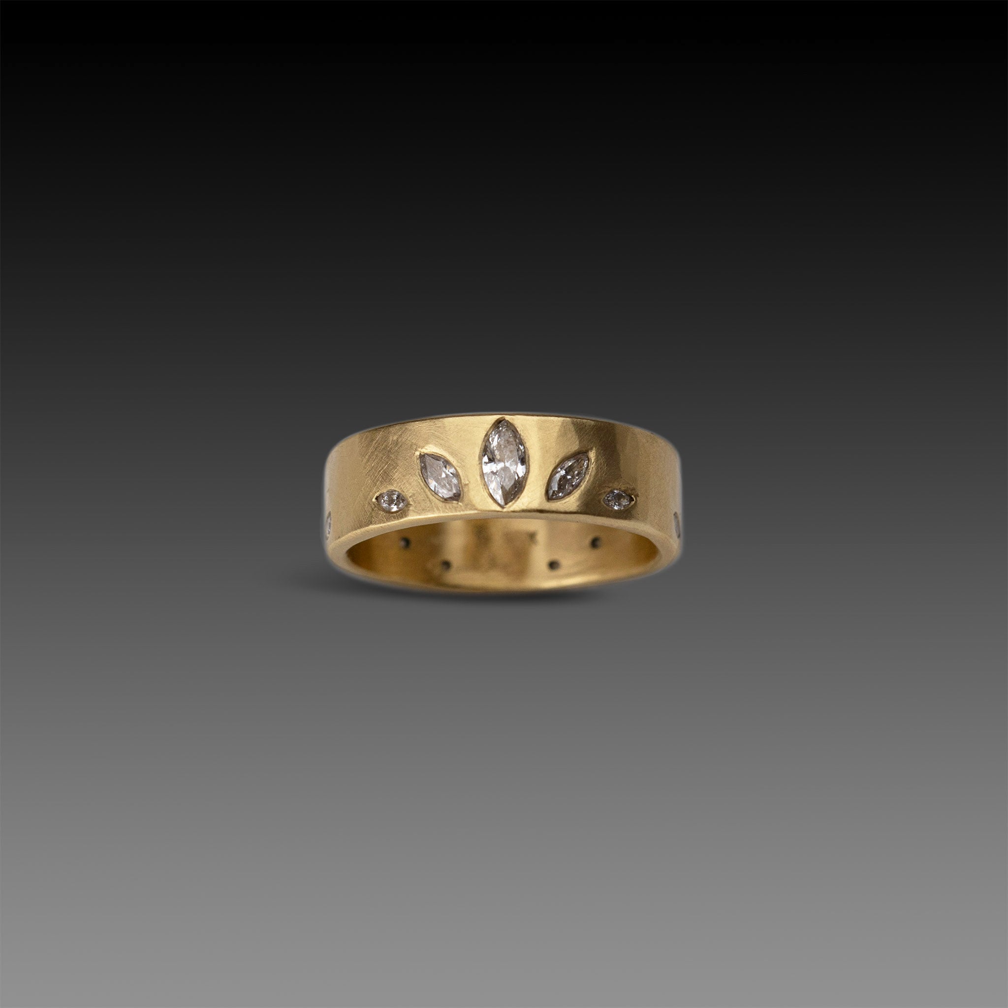 Fifteen marquis diamonds are arranged into three lotus flowers that encircle this 18k gold, 6mm hammered band. It is a special yet classic choice as a wedding or commitment band. The hammered texture is both organic and refined. It stands alone, or stacks wonderfully with other rings in our collection. Matte finish.