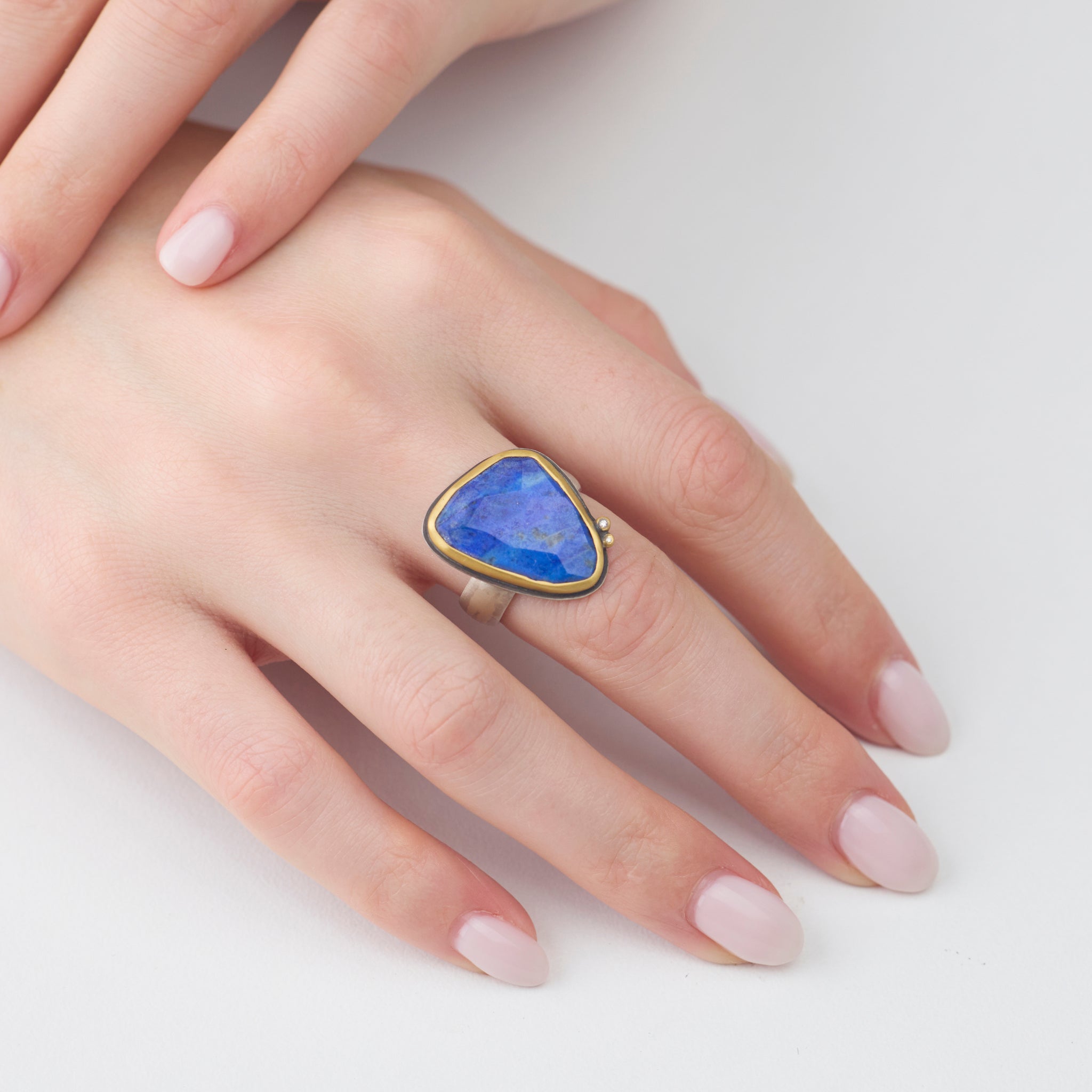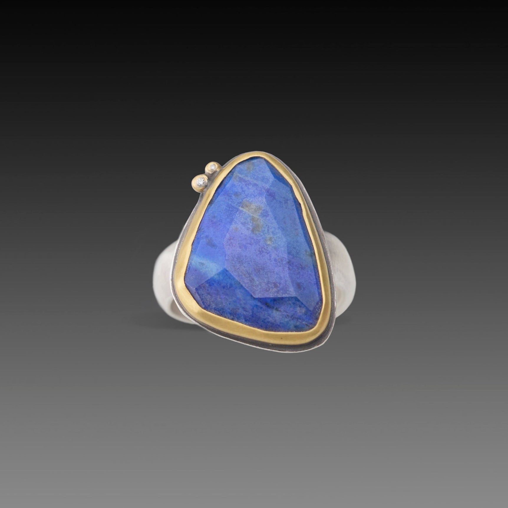 This amazing ring features a deeply colored, faceted lapis stone set in warm 22k gold and backed with sterling silver. Accented with two sparkling white diamond dots and a smooth 4mm sterling silver band.