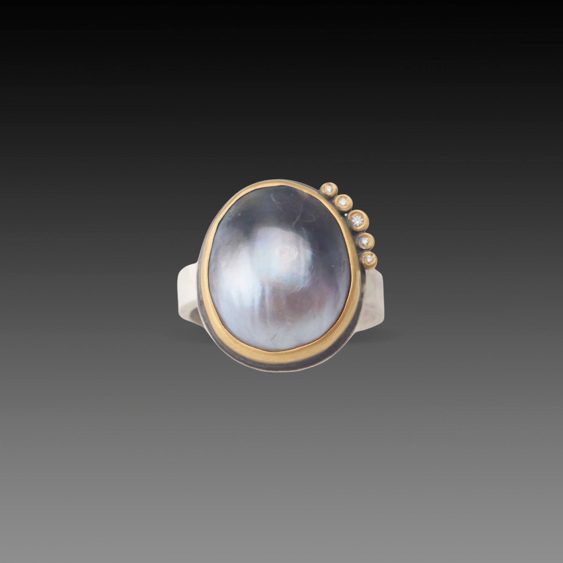 A magically lustrous Tahitian Mabe pearl is wrapped in warm 22k gold, and accented with an arc of five sparkling white diamonds. A truly special ring, dancing with color and light. Sterling silver band and backing.