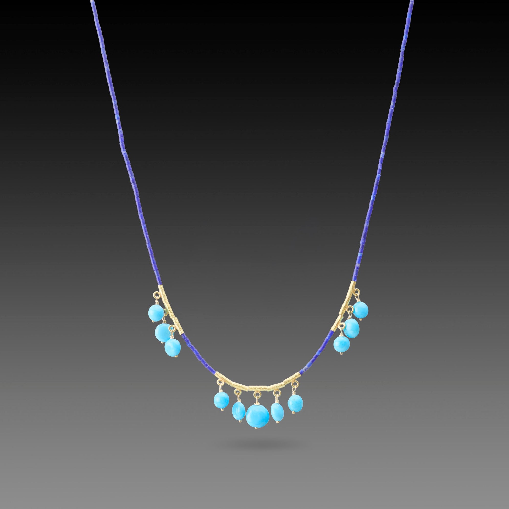 A lovely strand of deep blue, matte lapis beads is beautifully contrasted with bright fringes of turquoise drops suspended from 20k gold beads. A wonderfully striking piece.