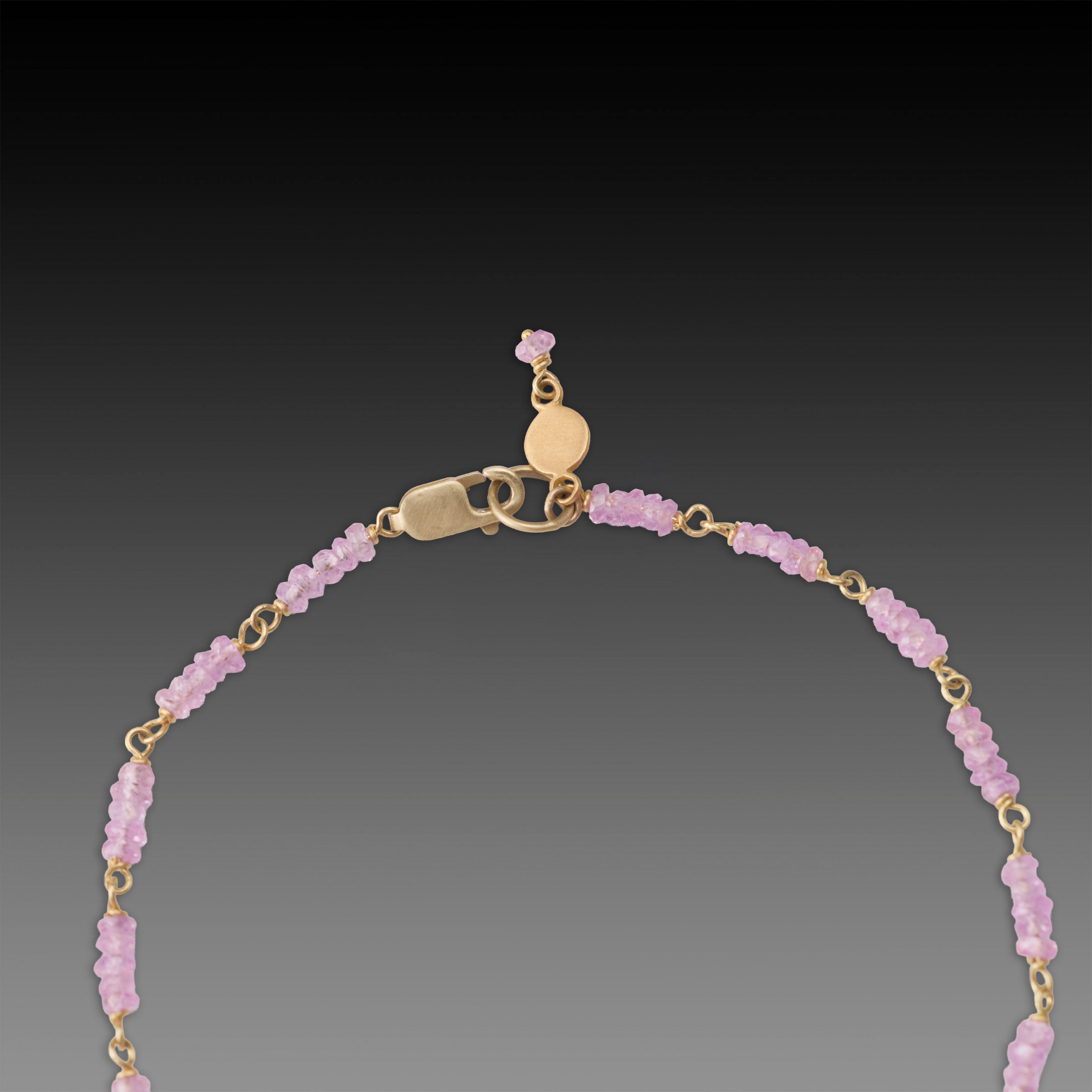 Sparkling sapphire beads in shades of pink, linked with 18k gold wire, encircle your wrist in this lovely bracelet. Finished with 22k gold charm at the 14k gold lobster clasp.