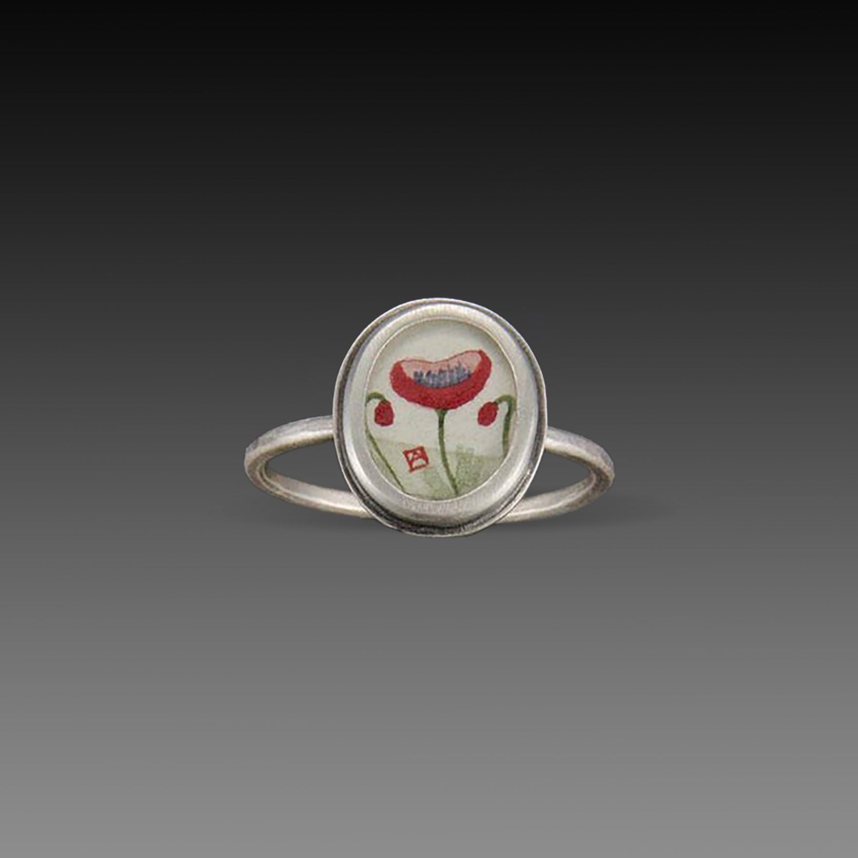 Symbolizing imagination and magic, this lovely bright poppy ring features an original acrylic painting on watercolor paper. Bezel set in sterling silver.
