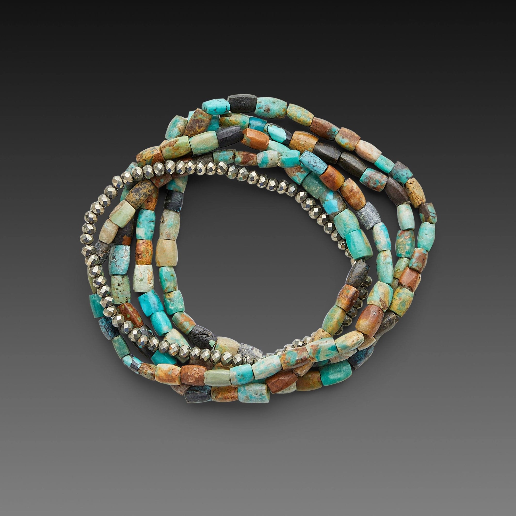 The five gemstone bracelets that make up this gorgeous set have been selected to complement one another perfectly, making the grouping versatile enough to wear all five together, a single bracelet alone, or in any combination you choose. This set includes two strands of rustic turquoise, Egyptian faience, a strand of turquoise with a handmade sterling silver charm and a single strand of contrasting, sparkly pyrite beads.