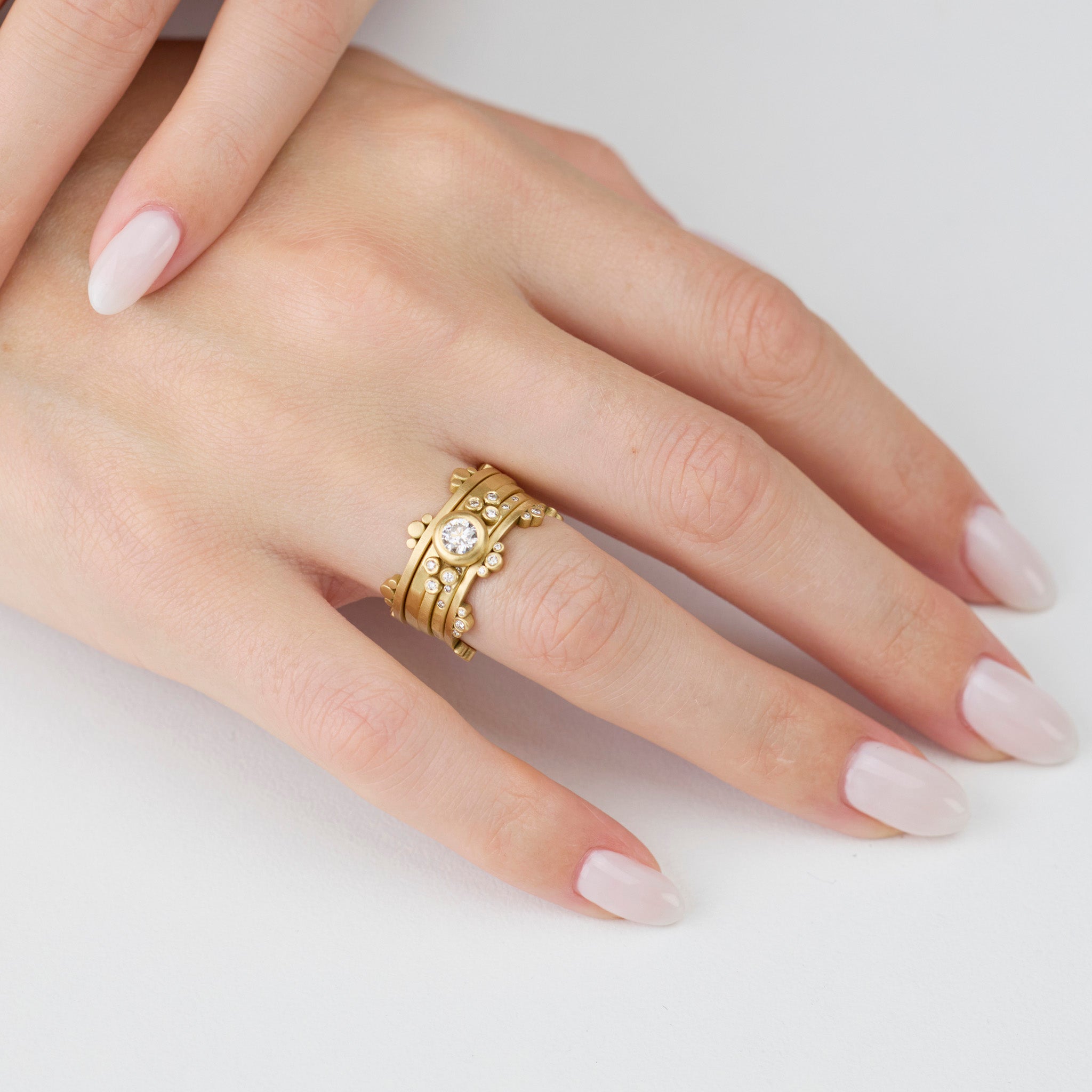 A gorgeous 5-ring stack set made up of 18k gold and diamonds. Curated with balance and sparkle, this stack is wonderfully versatile and pairs well with many pieces in our collection. Individual information about each ring is linked below.