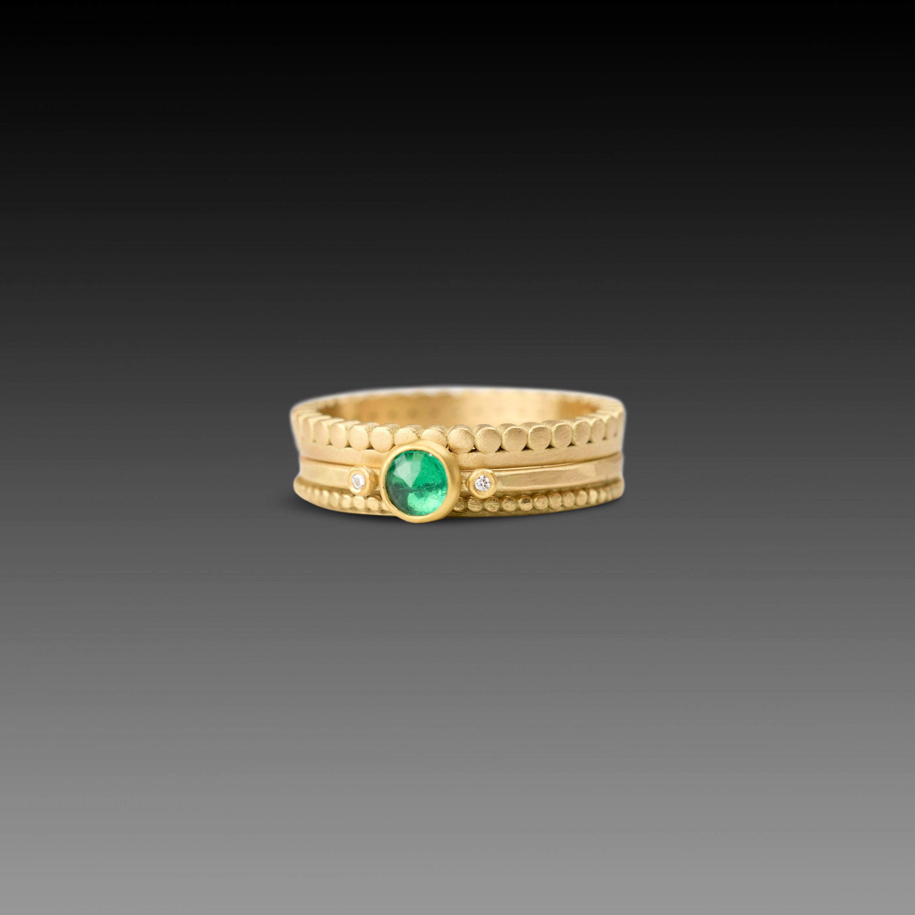 A precious 3-ring stacking set made up of 18k gold and diamonds. Featuring a dainty emerald as its centerpiece, this stack pairs well with many other jewels in our collection. Individual information about each ring is linked below.