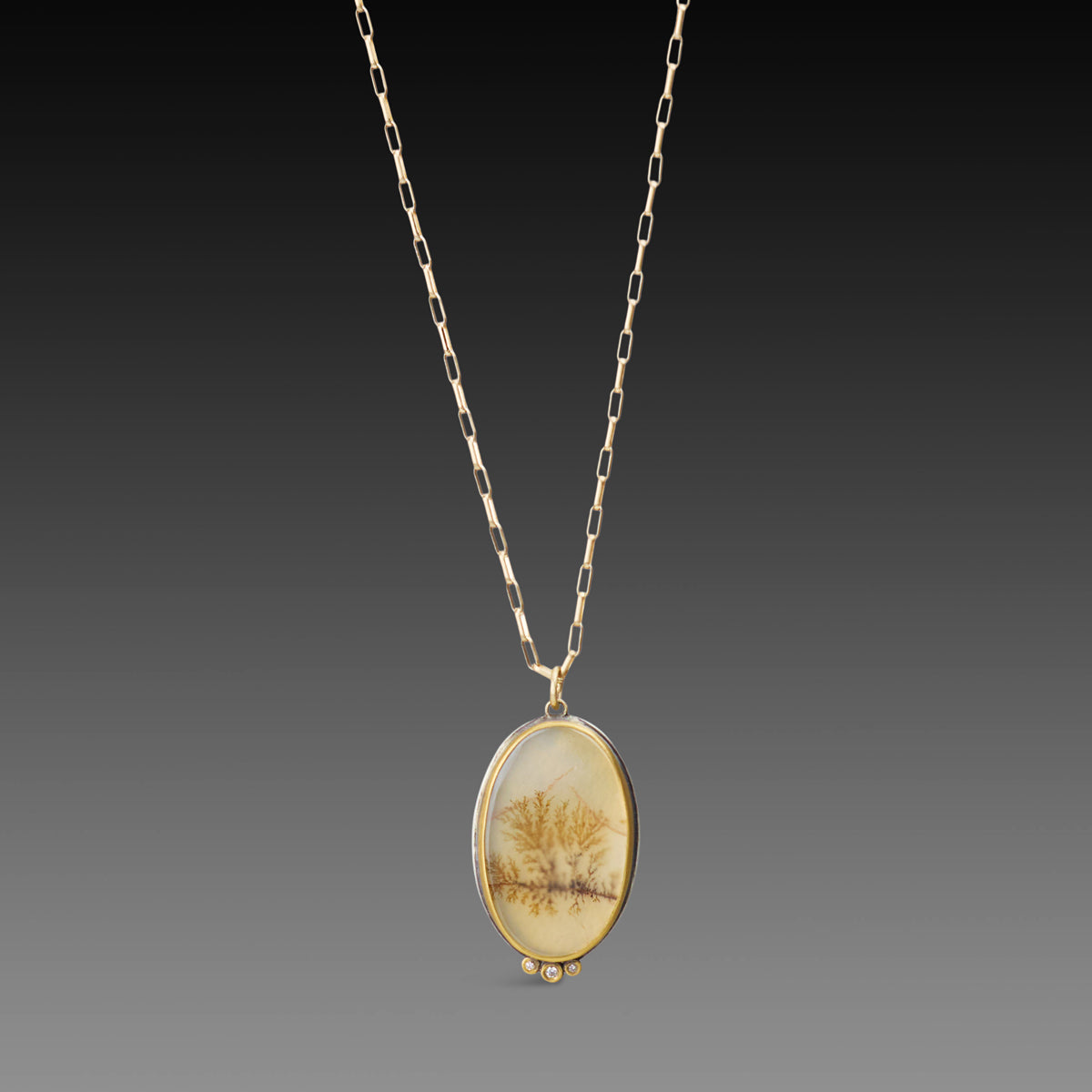 A very special dendritic agate evokes a mysterious and lovely nature scene. The stone is set in warm 22k gold bezel and backed with sterling silver, accented with three sparkling diamonds.