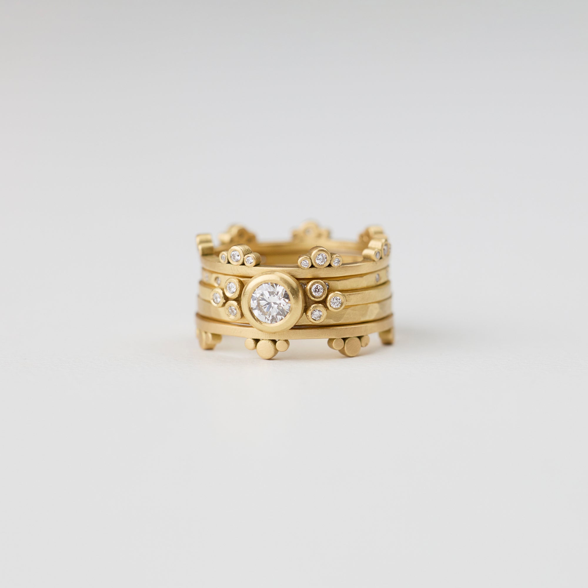 A gorgeous 5-ring stack set made up of 18k gold and diamonds. Curated with balance and sparkle, this stack is wonderfully versatile and pairs well with many pieces in our collection.