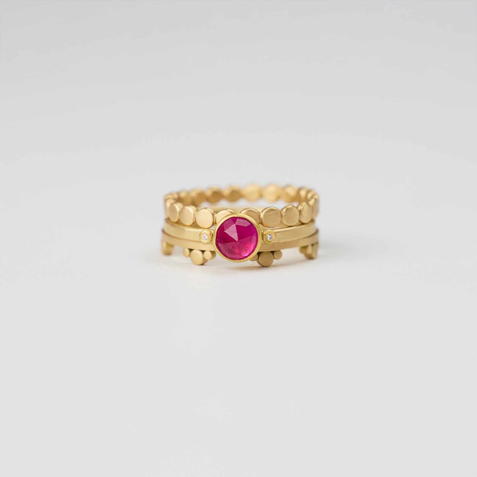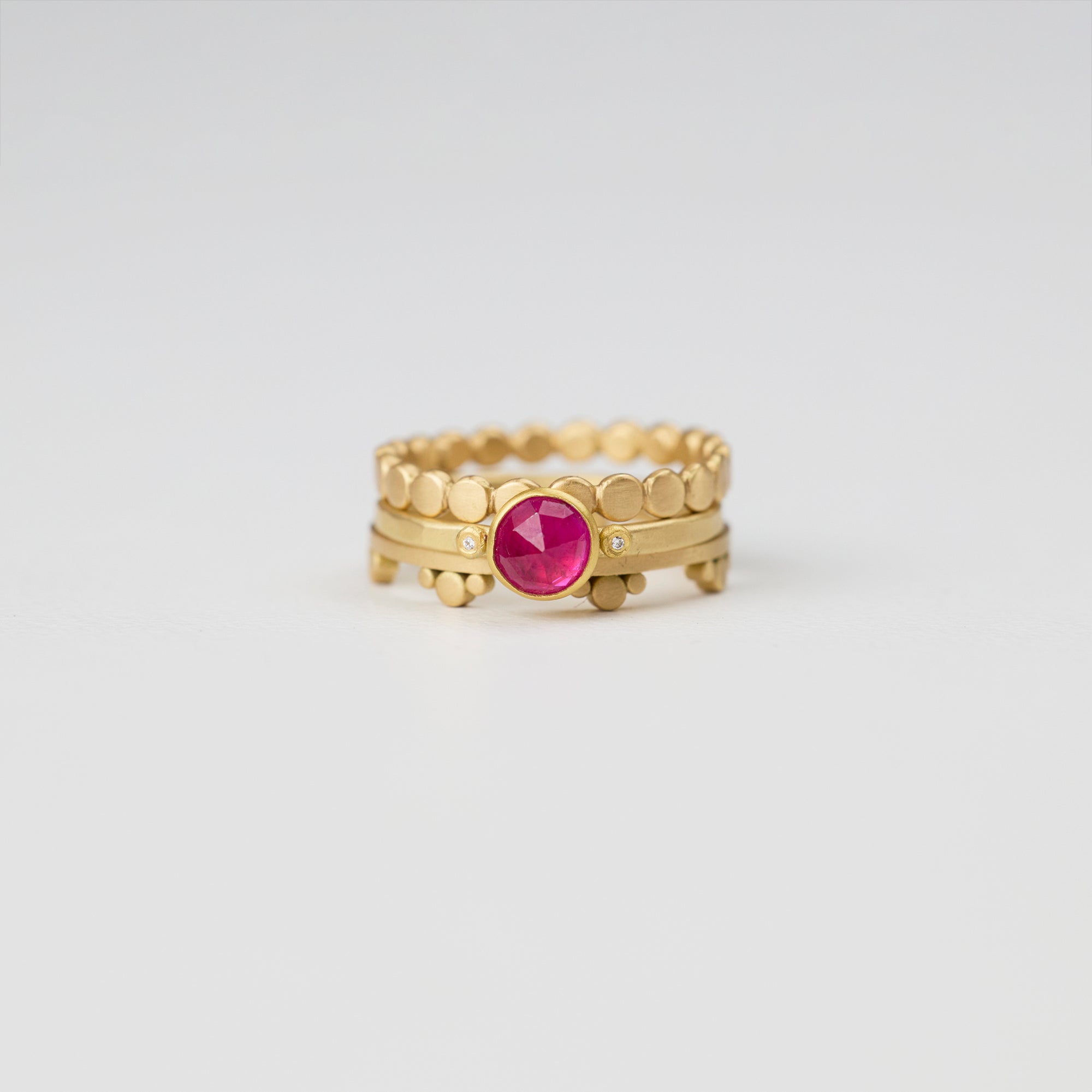 A precious 3-ring stacking set made up of 18k gold and diamonds. Featuring a dainty ruby as its centerpiece, this stack pairs well with many other jewels in our collection.