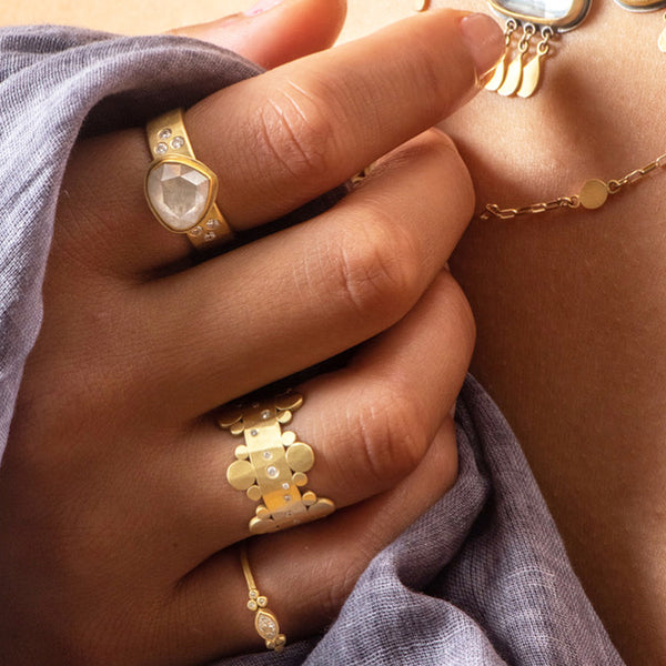 This lovely ring features a sparkling, brilliant cut, .31 carat marquise diamond measuring 7.5mm x 3.7mm, accented by trios of tiny 1.5mm diamonds. The stones are set on a 1.25mm hammered band which has a soft matte finish. This ring stacks beautifully with others in the collection.